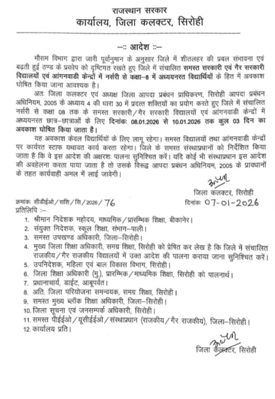 सिरोही जिले में शीतलहर की प्रबल सम्भावना एवं ठंड के प्रकोप चलते विद्यार्थियों की 3 दिवस छुट्टी घोषित