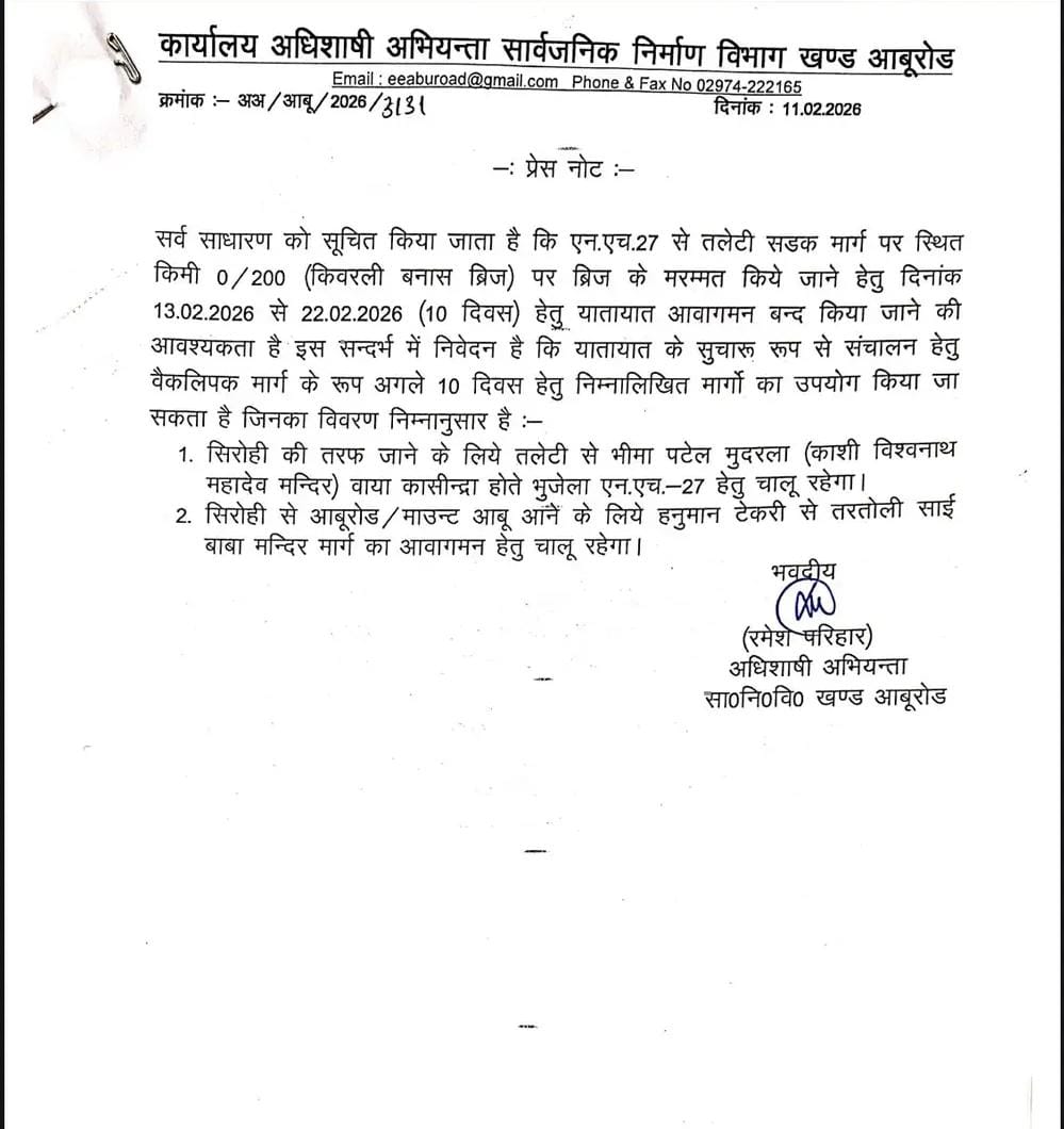 - सार्वजनिक निर्माण विभाग (PWD) खंड आबूरोड ने राष्ट्रीय राजमार्ग से आबूरोड की तरफ स्थित किवरली बनास ब्रिज की मरम्मत के लिए 10 दिनों तक यातायात बंद रखने का निर्णय लिया है।